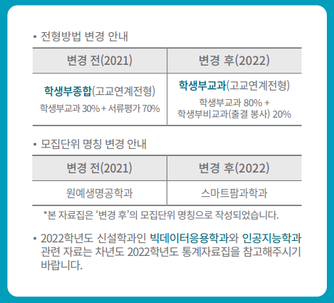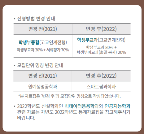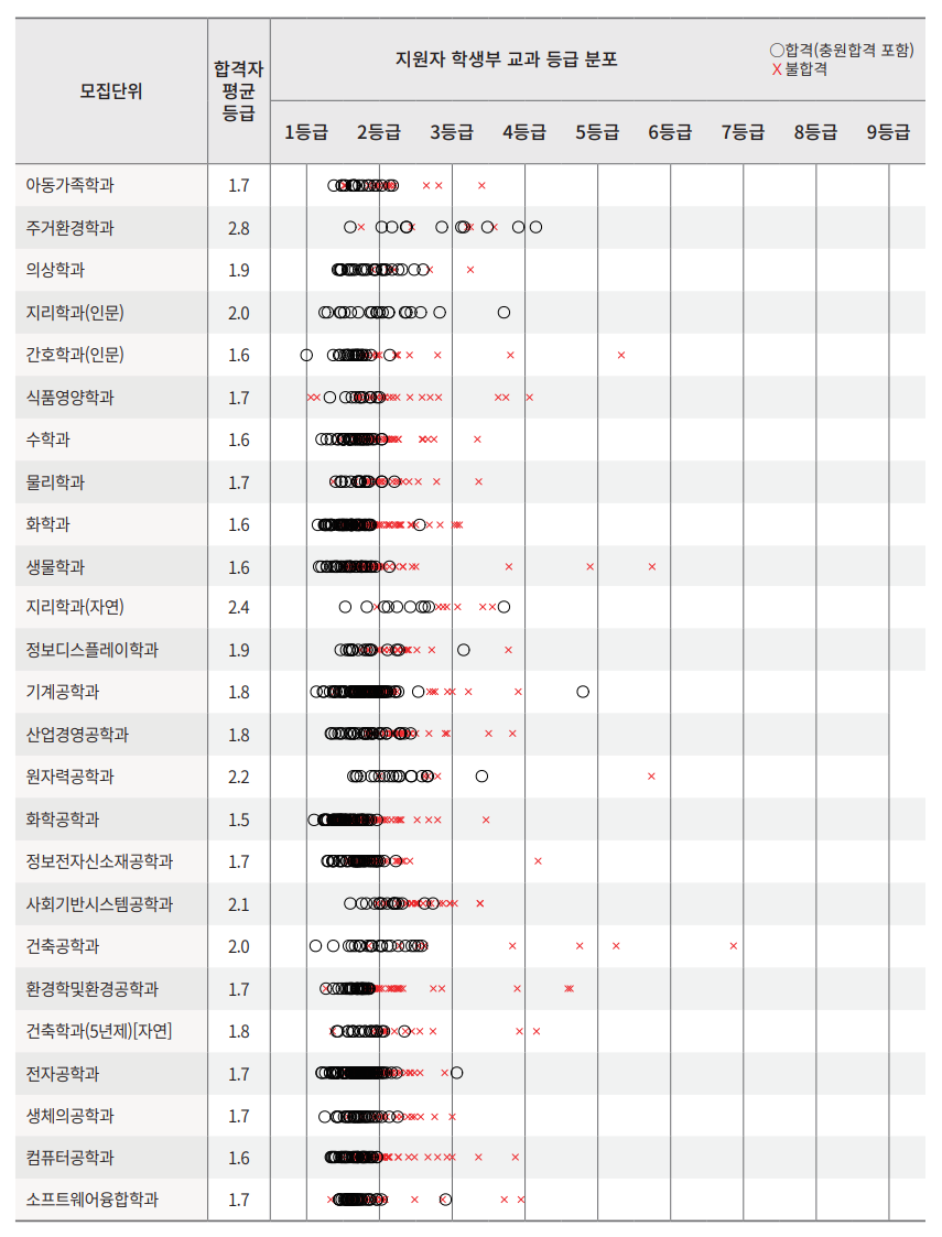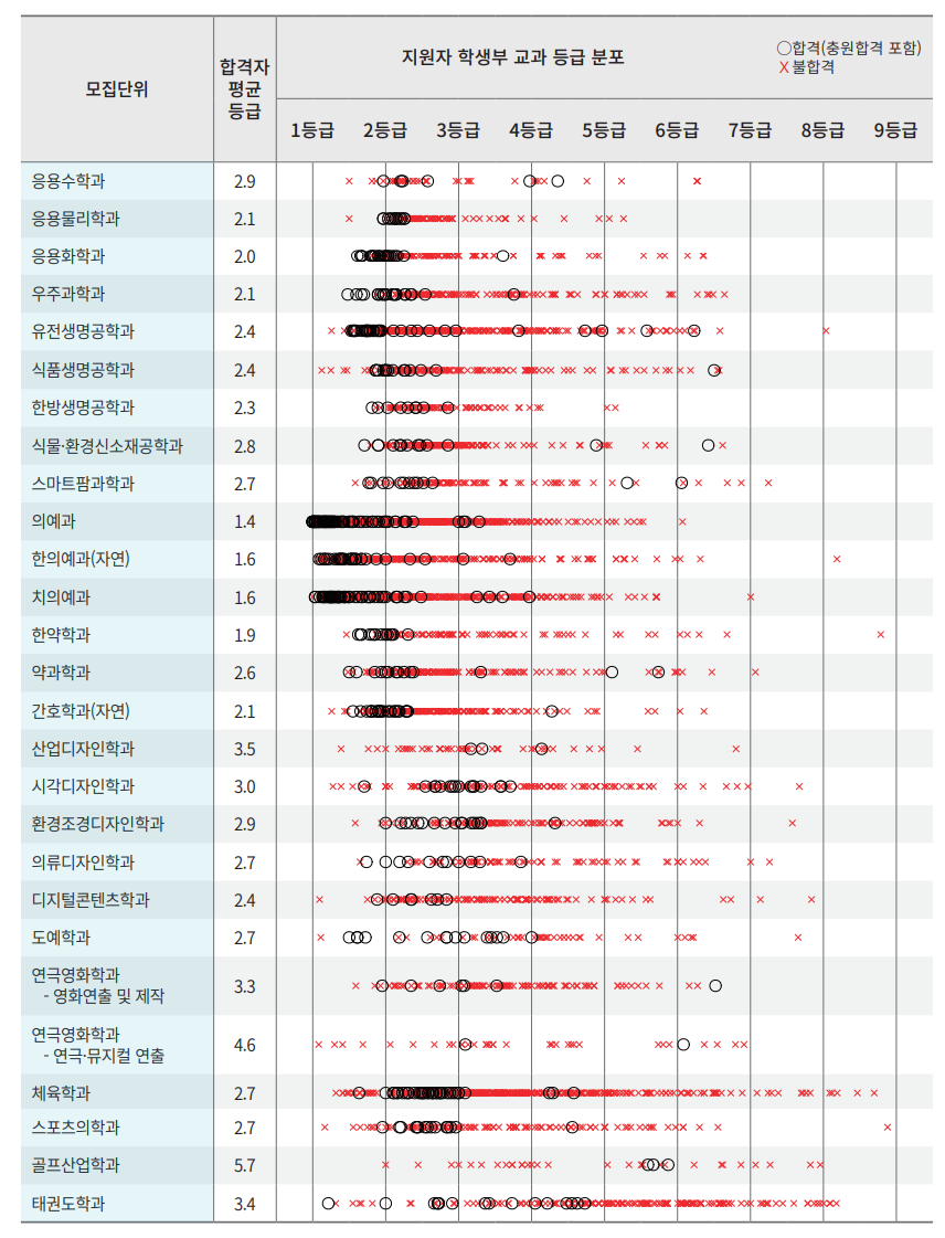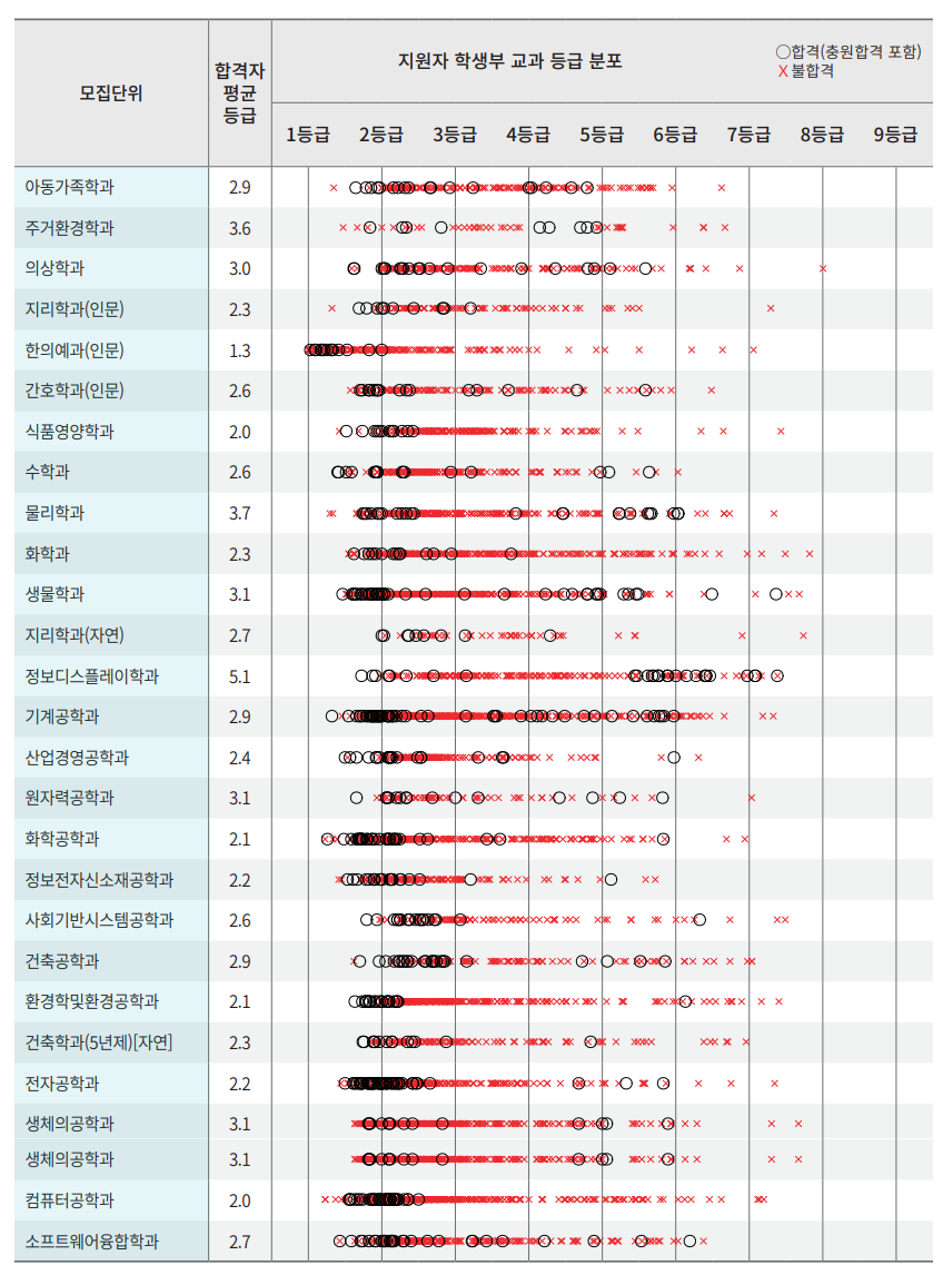 - 수능최저학력기준을 충족한 자 중에서 학생부교과 70%와 학생부비교과(출결,봉사) 30%를 합산하여 총점 순으로 선발