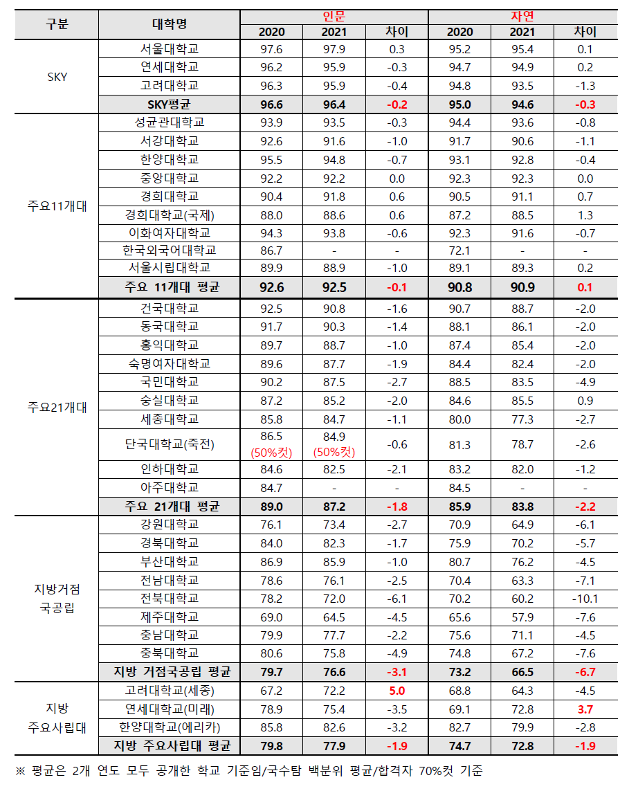 지방국대 8등급도 합격. 주요대학교별 정시 합격선 변화(2020 VS 2021)