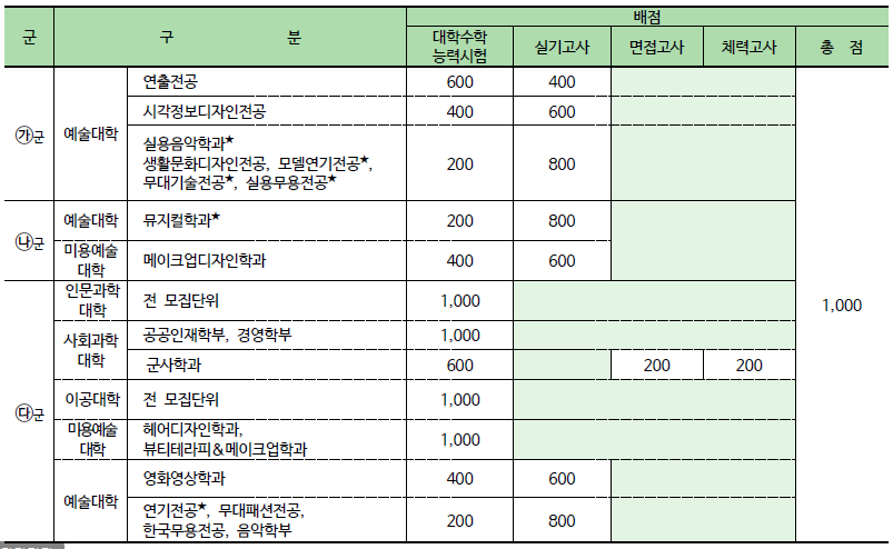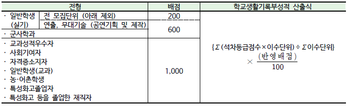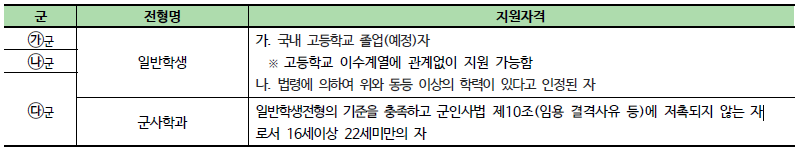 ※ 군사학과전형은 신체검사와 인성검사를 실시하여 합격, 불합격 자료로 활용