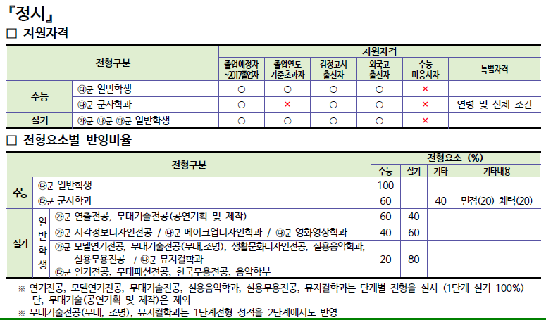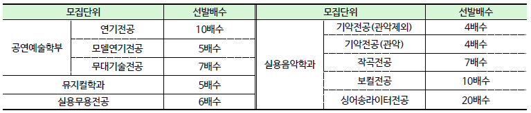 ※ ★ 표시의 모집단위는 단계별전형을 실시하며, 1단계전형은 실기 100%로 아래의 배수만큼 선발하여 2단계전형을 실시