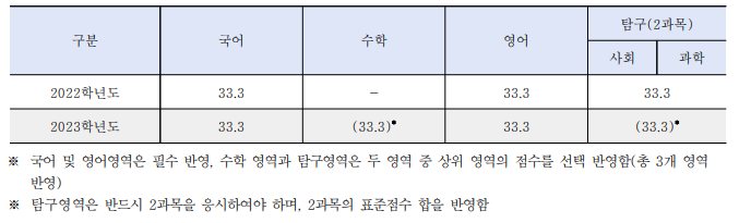 2. 정시모집 대학수학능력시험 인문계 영역별 반영비율 변경