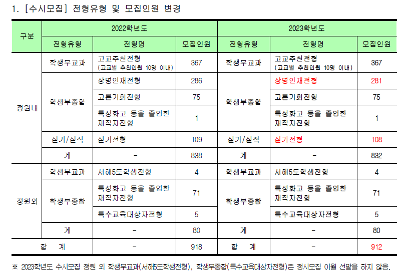 2023학년도 상명대학교 입학전형 주요변경사항