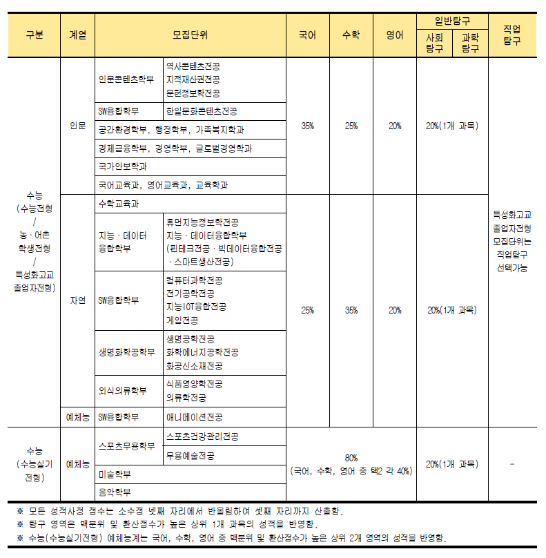 - 학교생활기록부 교과성적: 학생부교과(고교추천전형,서해5도학생전형),실기/실적(실기전형)