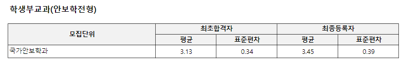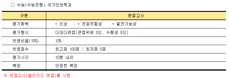 - 수능최저학력(국가안보학과 수능최저하력기준 없음): 국어,수학, 영어, 일반탐구[사회탐구/과학탐구(탐구영역 1개 과목 반영)] 중 2개 영역 등급 합 7등급 이내
