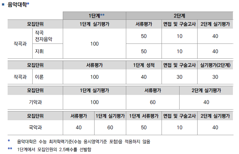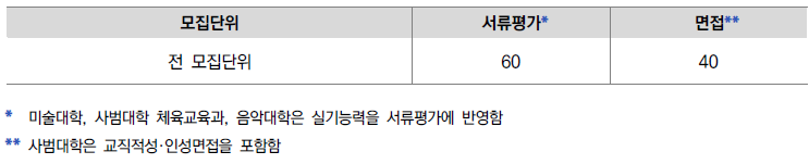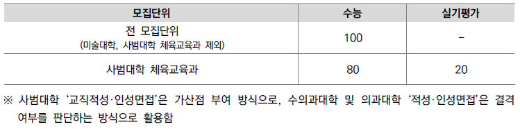* 사범대학 체육교육과는 수능 최저학력기준(수능 응시영역기준 포함)을 적용하며, 1단계 합격자 중 단체종목 지원자에