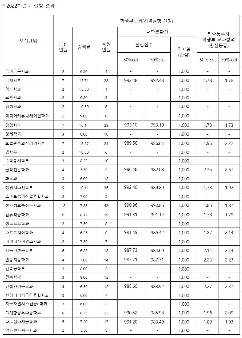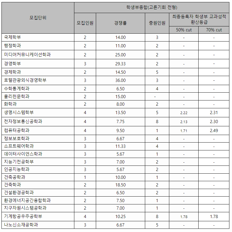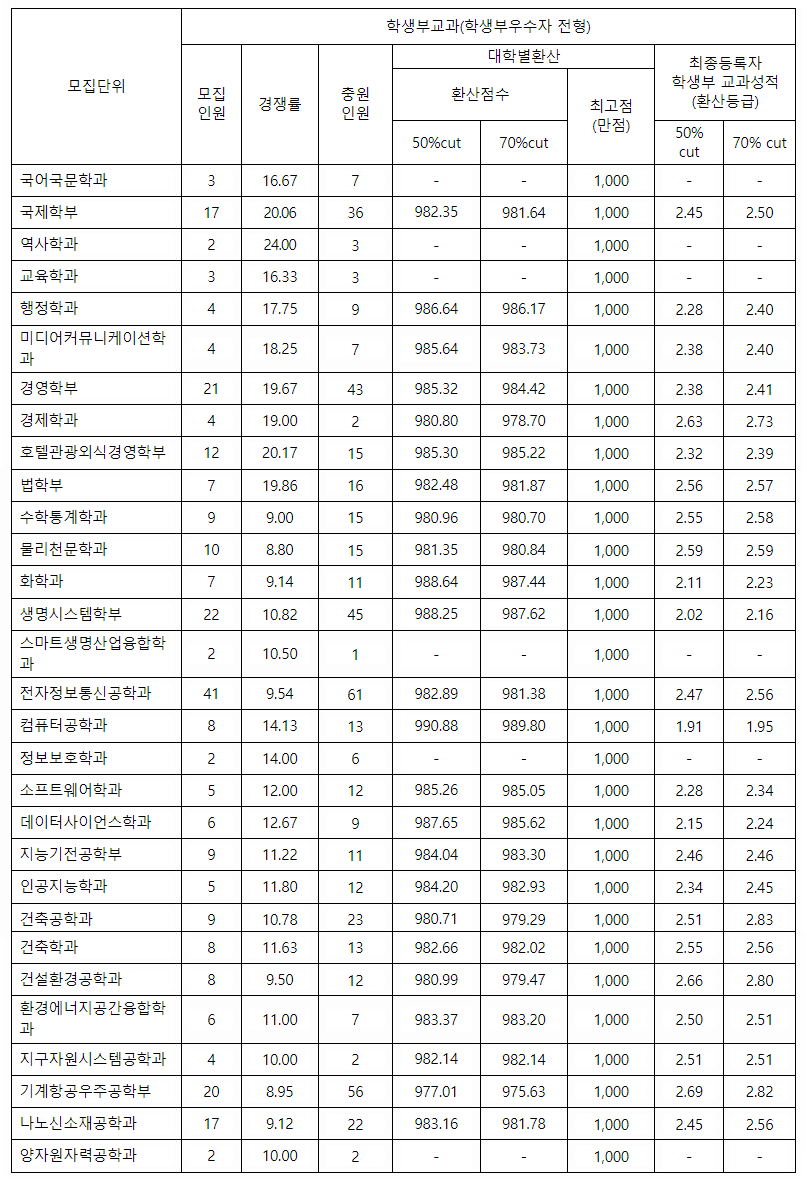 세종대학교 2022학년도 학생부교과전형 합격자 등급컷