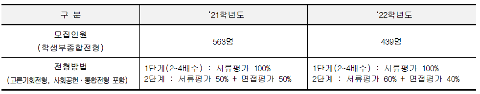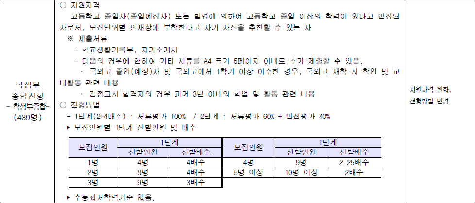 라. 학생부종합전형 모집인원 감축 및 전형방법 변경수시모집 전형유형별 지원자격 및 전형방법