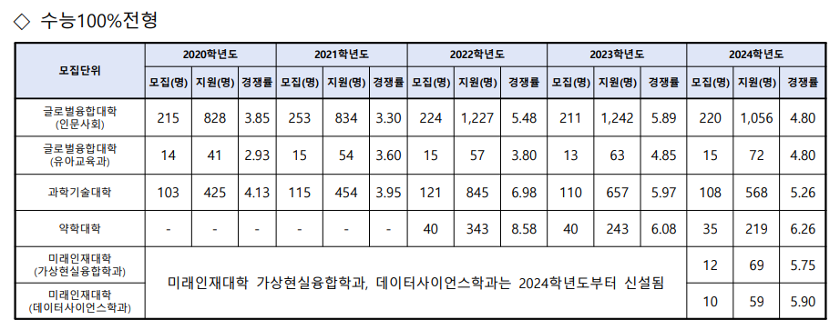 수시 모집에서는 글로벌융합대학(인문사회)와 과학기술대학의 경쟁률이 다소 하락했으며, 약학대학은 높은 성적을 요구하는 경향이 지속되었습니다.
