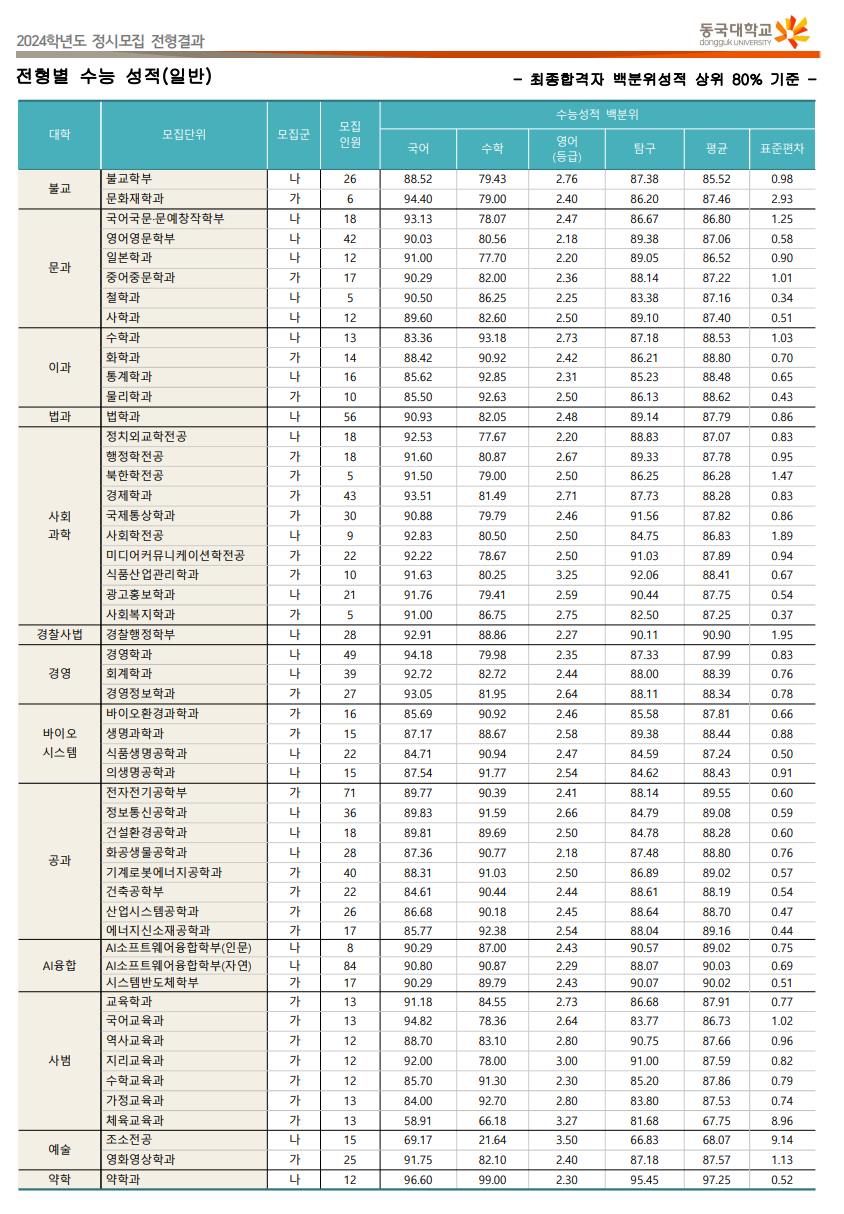 동국대학교 2024학년도 수시등급 컷 정시백분위 컷