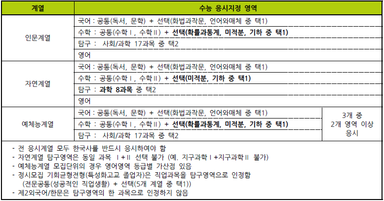 * 계열은 아래의 응시 계열별 수능 응시 지정 영역 구분임