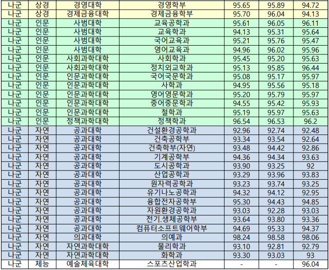 1. 한양대학교 2020학년도 정시모집(정시일반 가군/나군) 입학생 수능백분위 평균현황