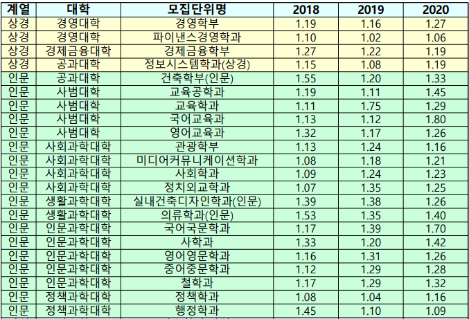 2. 한양대학교 2020학년도 학생부교과전형 경쟁률현황