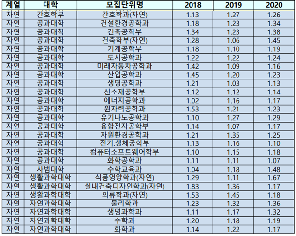 ※ 상기 경쟁률은 수시모집 미등록 이월인원을 정시모집인원에 가산한 뒤 지원인원 대비 산출한 경쟁률입니다. 따라서 상기 경쟁률은 한양대학교 입학처 홈페이지에 게재된 지원당시 경쟁률과 상이할 수 있습니다.