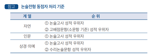 - 논술고사가 중심인 전형으로 논술고사 성적에 따라 당락이 좌우됨