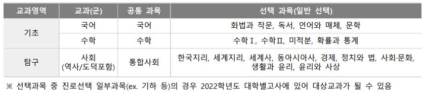 ⦁ 논술시험 적용 교육과정 및 대상교과 : 2015 개정 교육과정의 보통교과(공통과목+선택과목), 전문교과 제외